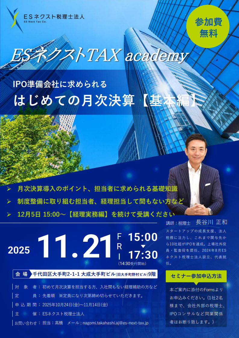 ESネクスト税理士法人では、定期的に「ESネクスト TAX Academy」としてセミナーを開催いたします。